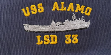 Navy jacket with Alamo ship logo printed above left pocket