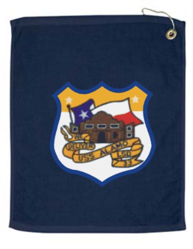 Alamo shield image printed in large 8" crest on one side of towel